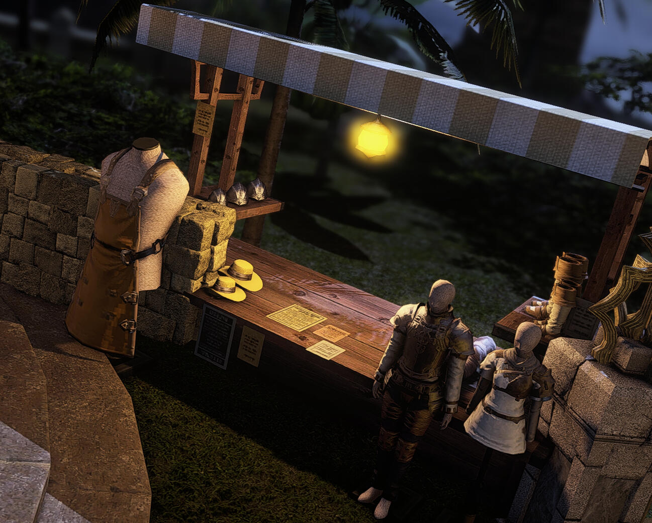 | Zu finden sei Gustav sowohl an seinem altbekannten Stand am Kuppenmarkt als nun auch nach neuesten Expansionen im Goldmond Basar An mancher Sonne sieht man ihn sogar mit einem komplett mobilen Stand durch die Perle der Wüste ziehen. Das Angebot des Grillmeisters solle jedoch an jedem der täglich wechselnden Standorte beständig sein und immerzu hervorragende Qualität aufweisen. Unterstützt wird er bei seinen Grilltätigkeiten mittlerweile von zwei Lalafell - Jojonen Ririnen und Chachapoki Dadapoki (ebenfalls NPC). Das gute Fleisch für die beliebten Spieße, ob nun mit eigens kreierter milderer oder schärferer Soße, soll unter anderem von den Jägern der Die trunkene Sau stammen. Das angebotene Bier stammt aus den Fässern der Brauerei Aubrey. Gemüse, Toffeln, Gewürze und Milch werden täglich frisch auf dem Saphirstraßenmarkt oder direkt am Goldmondbasar erstanden. Alle Zutaten unterliegen einer stetigen Kühlkette und werden am jeweiligen Grillstand in einem kleinen Permafrostschrank aufbewahrt. |